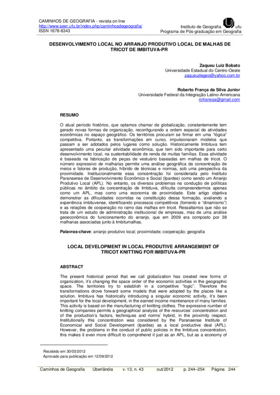 DESENVOLVIMENTO LOCAL NO ARRANJO PRODUTIVO LOCAL DE MALHAS DE TRICOT DE IMBITUVA-PR