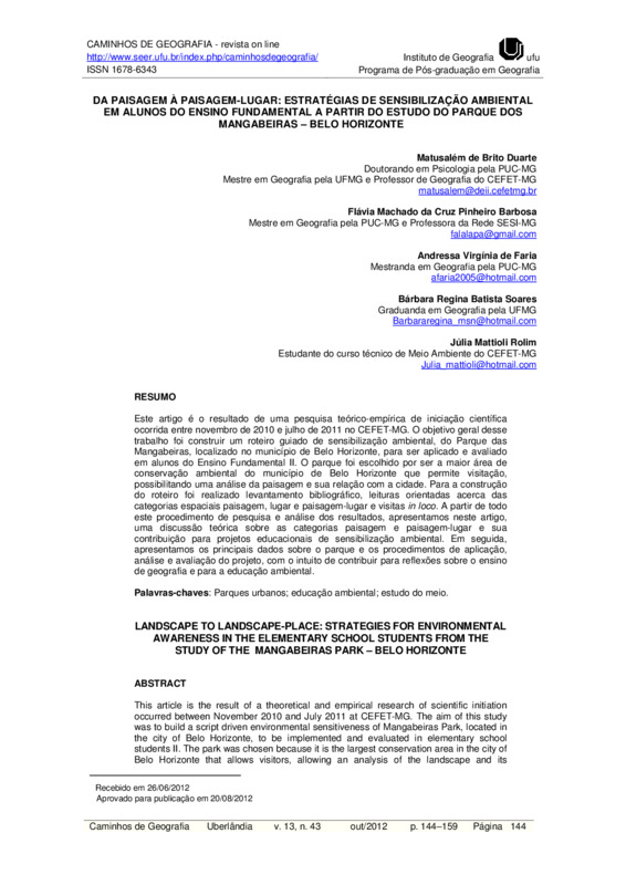 DA PAISAGEM À PAISAGEM-LUGAR: ESTRATÉGIAS DE SENSIBILIZAÇÃO AMBIENTAL EM ALUNOS DO ENSINO FUNDAMENTAL A PARTIR DO ESTUDO DO PARQUE DOS MANGABEIRAS – BELO HORIZONTE