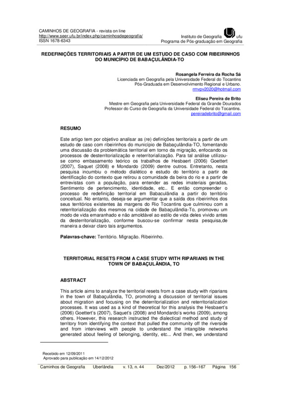Este artigo teve por objetivo analisar as (re)definições territoriais a partir de um estudo de caso com os ribeirinhos na Vila dos “Alagados” no município de Babaçulândia-TO, fomentando uma discussão da problemática territorial em torno da migração, enfocando os processos de desterritorialização e reterritorialização. Para fazer tal análise utilizamos como metodologia os trabalhos de Hesbaert (2006) Goettert (2007), Saquet (2008) e Mondardo (2009) dentre outros. A pesquisa também foi norteada por trabalhos de campo realizados na comunidade Vila dos Alagados. Para tanto, verificou-se por meio das narrativas dos ribeirinhos de forma implícita o conceito de território e migração e o que os processos migratórios representam para o cotidiano dos mesmos. Diante disso, notamos que a migração provoca o rompimento de laços afetivos, cultural e de identidade modificando, o cotidiano ribeirinho