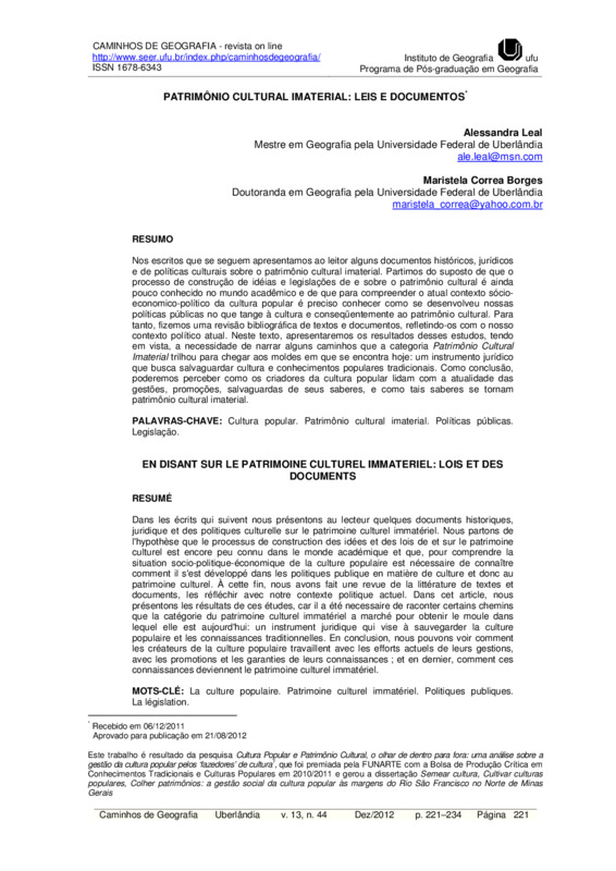 PATRIMÔNIO CULTURAL IMATERIAL: leis e documentos