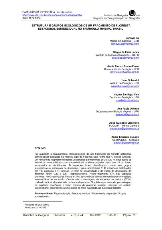 ESTRUTURA E GRUPOS ECOLÓGICOS DE UM FRAGMENTO DE FLORESTA ESTACIONAL SEMIDECIDUAL NO TRIÂNGULO MINEIRO, BRASIL