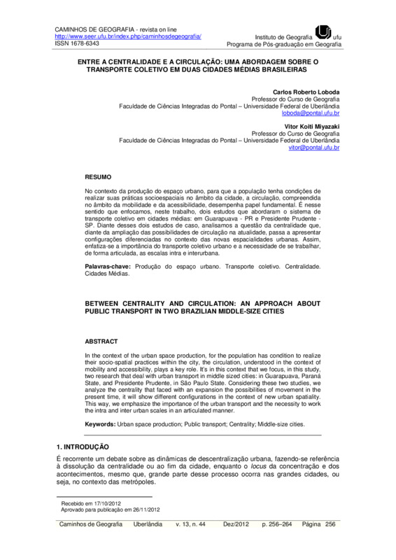 No contexto da produção do espaço urbano, para que a população tenha condições de realizar suas práticas socioespaciais no âmbito da cidade, a circulação, compreendida no âmbito da mobilidade e da acessibilidade, desempenha papel fundamental. É nesse sentido que enfocamos, neste trabalho, dois estudos que abordaram o sistema de transporte coletivo em cidades médias: em Guarapuava - PR e Presidente Prudente - SP. Diante desses dois estudos de caso, analisamos a questão da centralidade que, diante da ampliação das possibilidades de circulação na atualidade, passa a apresentar configurações diferenciadas no contexto das novas espacialidades urbanas. Assim, enfatiza-se a importância do transporte coletivo urbano e a necessidade de se trabalhar, de forma articulada, as escalas intra e interurbana.