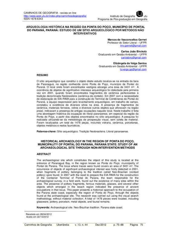 ARQUEOLOGIA HISTÓRICA NA REGIÃO DA PONTA DO POÇO, MUNICÍPIO DE PONTAL DO PARANÁ, PARANÁ: ESTUDO DE UM SÍTIO ARQUEOLÓGICO POR MÉTODOS NÃO INTERVENTIVOS