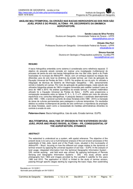 A bacia hidrográfica entendida como sistema é considerada como referência espacial. O objetivo do presente estudo consiste em realizar uma investigação multitemporal do processo de perda de solo nas bacias hidrográficas dos rios São João, Iporã e do Prado localizadas no município de Altônia/PR – Brasil, com um enfoque especial na relação dos diferentes usos do solo local na dinâmica da erosão laminar, por meio da aplicação da Equação Universal de Perdas de Solo – EUPS. Na análise do uso do solo, foi utilizada a integração de técnicas de Sistema de Informação Geográfica – SIG, sensoriamento remoto e trabalho em campo. Por meio da aplicação de geotecnologias, neste estudo são utilizados fotografias aéreas de 1963 e imagens fornecidas pelo satélite Landsat 5 para os anos de 1985 e 2010. Na análise quantitativa da erosão laminar, o modelo matemático utilizado foi a Equação Universal de Perdas de Solos – EUPS, pois proporciona a comparação necessária entre os fatores R, K, L, S, C e P, obtidos por meio de cálculos específicos e/ou consultas bibliográficas. A pesquisa destaca o acelerado desmatamento entre 1963 – 1985, o sensível aumento de áreas florestais entre 1985 - 2010 e a transição de áreas de culturas permanentes para pastagens e culturas temporárias. Os resultados obtidos na análise multitemporal de perdas de solo confirmam a importância da ampliação de áreas florestais, assim como a necessidade de medidas administrativas eficientes no controle à erosão do solo.