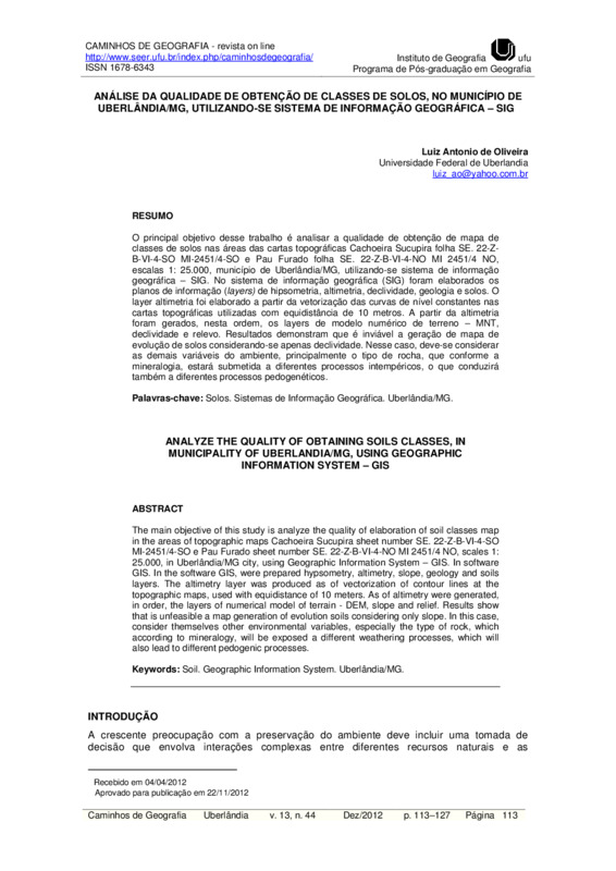 O principal objetivo desse trabalho é analisar a qualidade de obtenção de mapa de classes de solos nas áreas das cartas topográficas Cachoeira Sucupira folha SE. 22-Z-B-VI-4-SO MI-2451/4-SO e Pau Furado folha SE. 22-Z-B-VI-4-NO MI 2451/4 NO, escalas 1: 25.000, município de Uberlândia/MG, utilizando-se sistema de informação geográfica – SIG. No sistema de informação geográfica (SIG) foram elaborados os planos de informação (layers) de hipsometria, altimetria, declividade, geologia e solos. O layer altimetria foi elaborado a partir da vetorização das curvas de nível constantes nas cartas topográficas utilizadas com eqüidistância de 10 metros. A partir da altimetria foram gerados, nesta ordem, os layers de modelo numérico de terreno – MNT, declividade e relevo. Resultados demonstram que é inviável a geração de mapa de evolução de solos considerando-se apenas declividade. Nesse caso, deve-se considerar as demais variáveis do ambiente, principalmente o tipo de rocha, que conforme a mineralogia, estará submetida a diferentes processos intempéricos, o que conduzirá também a diferentes processos pedogenéticos.