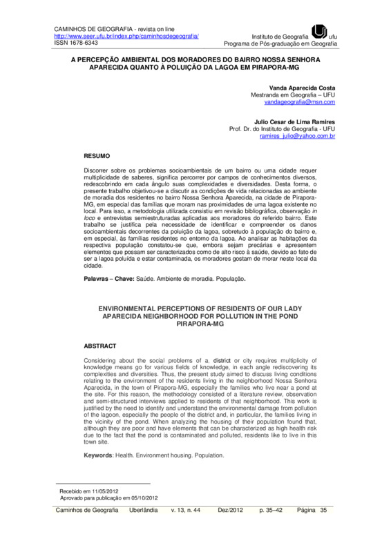 A PERCEPÇÃO AMBIENTAL DOS MORADORES DO BAIRRO NOSSA SENHORA APARECIDA QUANTO À POLUIÇÃO DA LAGOA EM PIRAPORA-MG