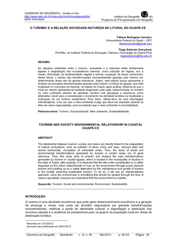 As relações existentes entre o turismo, sociedade e a natureza estão diretamente ligadas à degradação dos ecossistemas naturais, como poluição de lagoas, rios e mares, diminuição da biodiversidade vegetal e animal, ocupação de áreas vulneráveis. Desta forma, o estudo das transformações socioambientais geradas pelo turismo em determinadas áreas são de grande relevância. Assim, este estudo busca apresentar e analisar as principais transformações geradas pelo turismo no litoral do Iguape, que está localizado no município de Aquiraz, no estado do Ceará, após análise, observa-se que o local em estudo apresenta-se bastante degradado pela ação indiscriminada do homem no meio ambiente através da atividade turística mal planejada e aponta-se como alternativa viável para a manutenção e incremento da atividade turística na localidade a realização de um turismo sustentável. Para tanto, utilizar-se-á de uma abordagem interdisciplinar, uma vez que o meio ambiente é algo que deve ser estudado através da ótica de vários especialistas, pois se entende que o meio ambiente é uma totalidade.