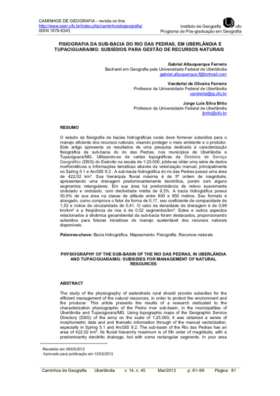 FISIOGRAFIA DA SUB-BACIA DO RIO DAS PEDRAS, EM UBERLÂNDIA E TUPACIGUARA/MG: SUBSÍDIOS PARA GESTÃO DE RECURSOS NATURAIS
