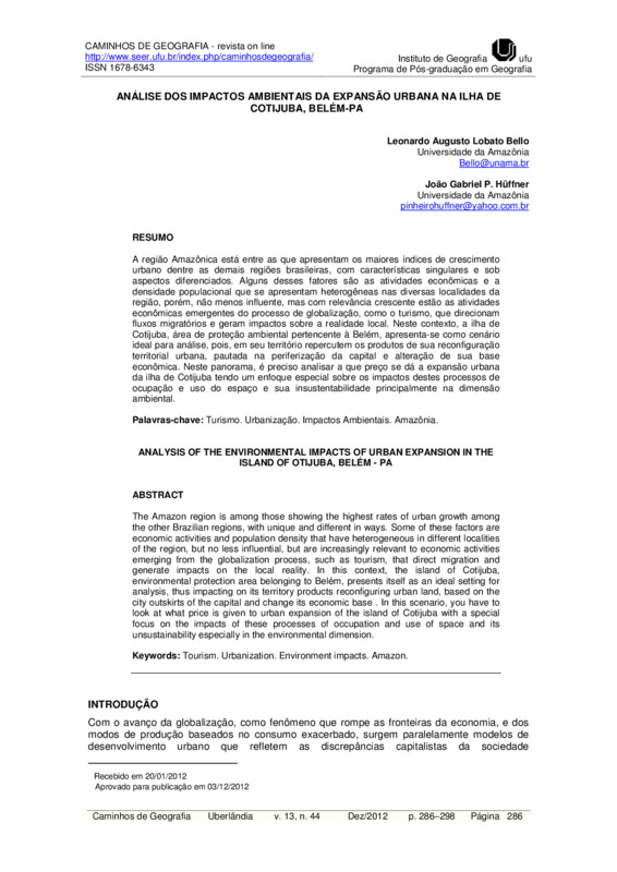 A região Amazônica está entre as que apresentam os maiores índices de crescimento urbano dentre as demais regiões brasileiras, com características singulares e sob aspectos diferenciados. Alguns desses fatores são as atividades econômicas e a densidade populacional que se apresentam heterogêneas nas diversas localidades da região, porém, não menos influente, mas com relevância crescente estão as atividades econômicas emergentes do processo de globalização, como o turismo, que direcionam fluxos migratórios e geram impactos sobre a realidade local. Neste contexto, a ilha de Cotijuba, área de proteção ambiental pertencente à Belém, apresenta-se como cenário ideal para análise, pois, em seu território repercutem os produtos de sua reconfiguração territorial urbana, pautada na periferização da capital e alteração de sua base econômica. Neste panorama, é preciso analisar a que preço se dá a expansão urbana da ilha de Cotijuba tendo um enfoque especial sobre os impactos destes processos de ocupação e uso do espaço e sua insustentabilidade principalmente na dimensão ambiental.