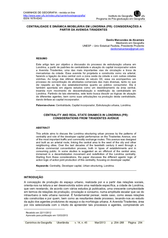 Este artigo tem por objetivo a discussão do processo de estruturação urbana em Londrina, a partir de padrões de centralidade e atuação do capital incorporador sobre a Avenida Tiradentes, uma das mais importantes vias de circulação e troca de mercadorias da cidade. Foi projetada e construída como via arterial, fazendo a ligação da área central com a zona oeste da cidade e com outras cidades vizinhas. Ao longo das últimas décadas do século XX, acompanhou um processo de concentração de atividades comerciais das mais diversas, tanto no que diz respeito ao tipo dos estabelecimentos quanto ao público consumidor. É também apontada em alguns estudos como um desdobramento da área central, inserida num movimento de descentralização e redefinição da centralidade em Londrina. Partindo de tais elementos, o artigo busca discutir as lógicas de atuação de diferentes agentes, bem como suas articulações na produção desta centralidade, dando ênfase ao capital incorporador.