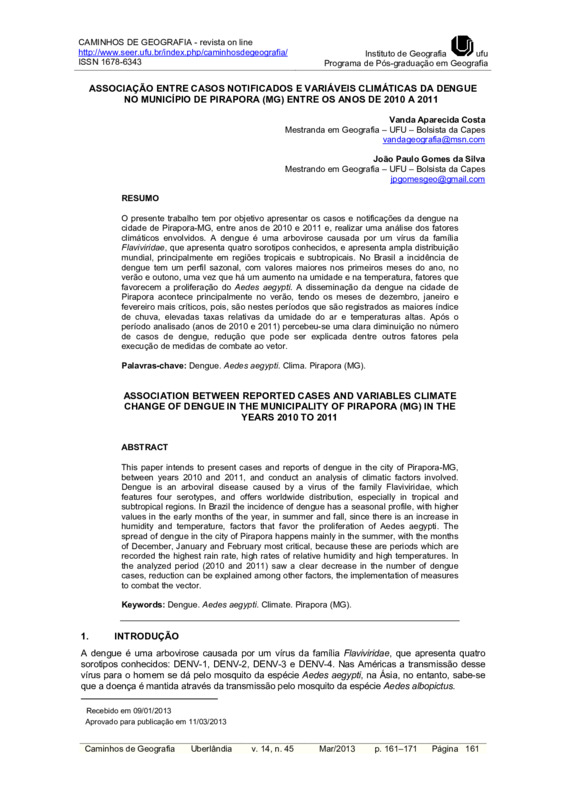 O presente trabalho tem por objetivo apresentar os casos e notificações da dengue na cidade de Pirapora-MG, entre anos de 2010 e 2011 e, realizar uma análise dos fatores climáticos envolvidos. A dengue é uma arbovirose causada por um vírus da família Flaviviridae, que apresenta quatro sorotipos conhecidos, e apresenta ampla distribuição mundial, principalmente em regiões tropicais e subtropicais. No Brasil a incidência de dengue tem um perfil sazonal, com valores maiores nos primeiros meses do ano, no verão e outono, uma vez que há um aumento na umidade e na temperatura, fatores que favorecem a proliferação do Aedes aegypti. A disseminação da dengue na cidade de Pirapora acontece principalmente no verão, tendo os meses de dezembro, janeiro e fevereiro mais críticos, pois, são nestes períodos que são registrados as maiores índice de chuva, elevadas taxas relativas da umidade do ar e temperaturas altas. Após o período analisado (anos de 2010 e 2011) percebeu-se uma clara diminuição no número de casos de dengue, redução que pode ser explicada dentre outros fatores pela execução de medidas de combate ao vetor.