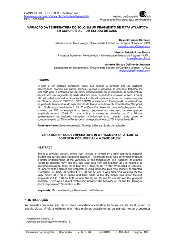 O solo é um sistema complexo, onde sua mistura é formada por um material heterogêneo dividido em partes sólidas, líquidas e gasosas. O presente trabalho foi realizado para a obtenção de um maior conhecimento da variabilidade da temperatura do solo em um fragmento de Mata Atlântica para os períodos, chuvoso e seco. Foram utilizados dados de saldo de radiação a 2 m de altura de uma torre micrometeorológica de 26 m de altura (10°00’37”S; 36°17’60”W) localizada em Coruripe-AL, analisando-se os perfis de temperatura do solo através de termopares tipo cobre/constantan(Campbell Sci., EUA) nas profundidades 1, 10, 20 e 50cm. Foi observado uma variação para o mês chuvoso de 7ºC no espaço e no tempo, enquanto no mês seco ocorreu grande amplitude térmica (13,41 ºC), para ambos os meses as camadas de 10 e 20 cm apresentaram as maiores variações. Verificou-se uma relação direta entre o comportamento da TS e do Rn, tendo uma resposta direta da TS a variação de Rn.