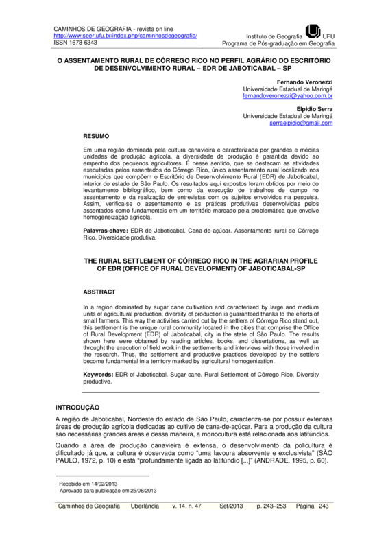 Em uma região dominada pela cultura canavieira e caracterizada por grandes e médias unidades de produção agrícola, a diversidade de produção é garantida devido ao empenho dos pequenos agricultores. É nesse sentido, que se destacam as atividades executadas pelos assentados do Córrego Rico, único assentamento rural localizado nos municípios que compõem o Escritório de Desenvolvimento Rural (EDR) de Jaboticabal, interior do estado de São Paulo. Os resultados aqui expostos foram obtidos por meio do levantamento bibliográfico, bem como da execução de trabalhos de campo no assentamento e da realização de entrevistas com os sujeitos envolvidos na pesquisa. Assim, verifica-se o assentamento e as práticas produtivas desenvolvidas pelos assentados como fundamentais em um território marcado pela problemática que envolve homogeneização agrícola.
