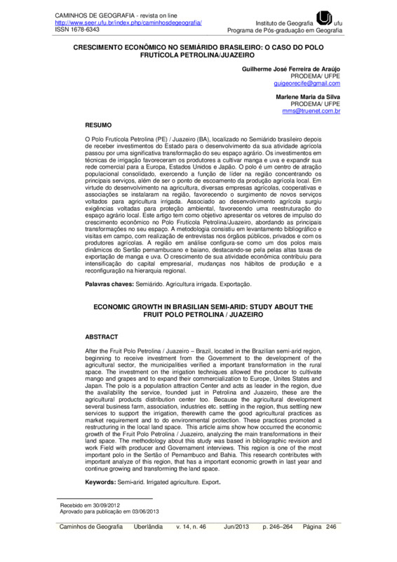O Polo Frutícola Petrolina (PE) / Juazeiro (BA), localizado no Semiárido brasileiro depois de receber investimentos do Estado para o desenvolvimento da sua atividade agrícola passou por uma significativa transformação do seu espaço agrário. Os investimentos em técnicas de irrigação favoreceram os produtores a cultivar manga e uva e expandir sua rede comercial para a Europa, Estados Unidos e Japão. O polo é um centro de atração populacional consolidado, exercendo a função de líder na região concentrando os principais serviços, além de ser o ponto de escoamento da produção agrícola local. Em virtude do desenvolvimento na agricultura, diversas empresas agrícolas, cooperativas e associações se instalaram na região, favorecendo o surgimento de novos serviços voltados para agricultura irrigada. Associado ao desenvolvimento agrícola surgiu exigências voltadas para proteção ambiental, favorecendo uma reestruturação do espaço agrário local. Este artigo tem como objetivo apresentar os vetores de impulso do crescimento econômico no Polo Frutícola Petrolina/Juazeiro, abordando as principais transformações no seu espaço. A metodologia consistiu em levantamento bibliográfico e visitas em campo, com realização de entrevistas nos órgãos públicos, privados e com os produtores agrícolas. A região em análise configura-se como um dos polos mais dinâmicos do Sertão pernambucano e baiano, destacando-se pela pelas altas taxas de exportação de manga e uva. O crescimento de sua atividade econômica contribuiu para intensificação do capital empresarial, mudanças nos hábitos de produção e a reconfiguração na hierarquia regional.