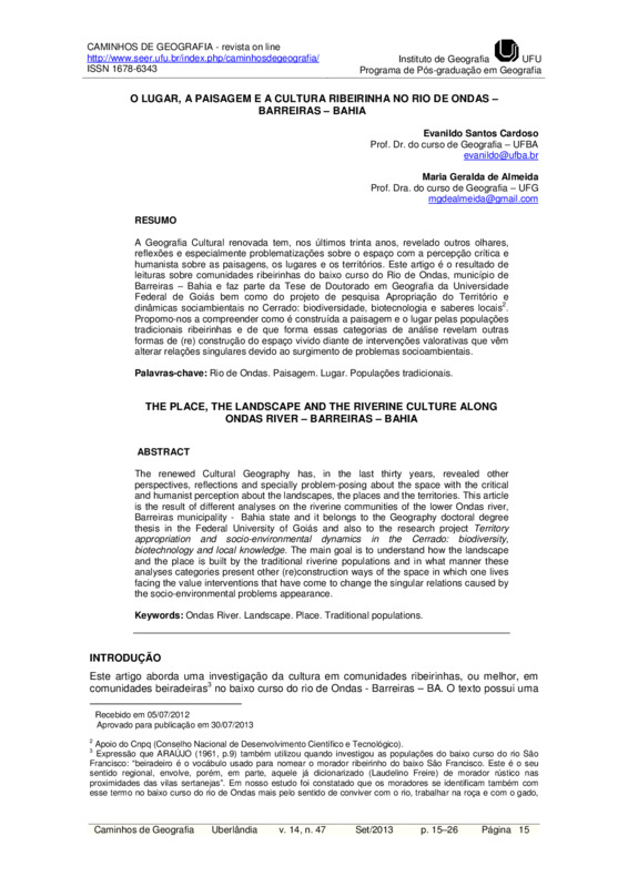 A Geografia Cultural renovada tem, nos últimos trinta anos, revelado outros olhares, reflexões e especialmente problematizações sobre o espaço com a percepção crítica e humanista sobre as paisagens, os lugares e os territórios. Este artigo é o resultado de leituras sobre comunidades ribeirinhas do baixo curso do Rio de Ondas, município de Barreiras – Bahia e faz parte da Tese de Doutorado em Geografia da Universidade Federal de Goiás bem como do projeto de pesquisa Apropriação do Território e dinâmicas sociambientais no Cerrado: biodiversidade, biotecnologia e saberes locais . Propomo-nos a compreender como é construída a paisagem e o lugar pelas populações tradicionais ribeirinhas e de que forma essas categorias de análise revelam outras formas de (re) construção do espaço vivido diante de intervenções valorativas que vêm alterar relações singulares devido ao surgimento de problemas socioambientais.