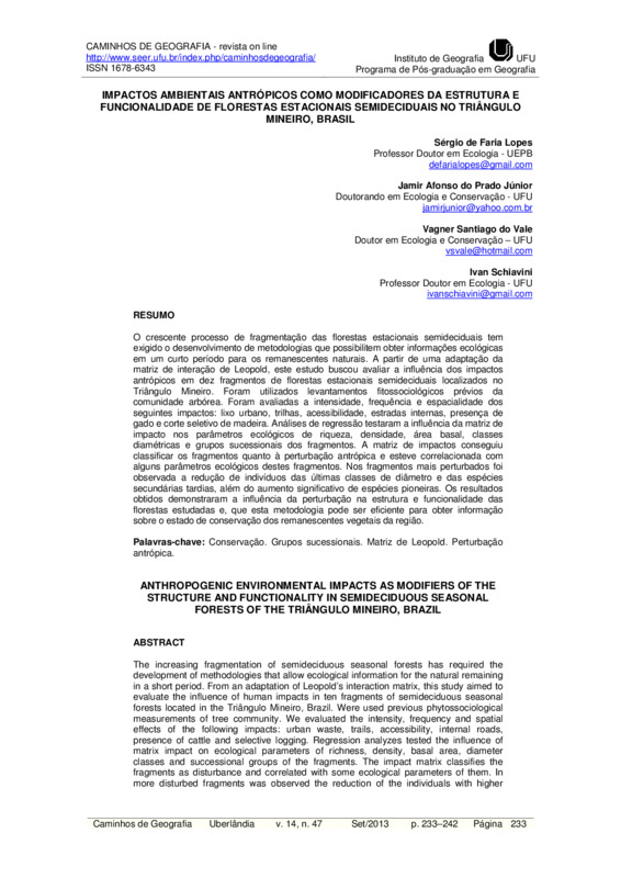 IMPACTOS AMBIENTAIS ANTRÓPICOS COMO MODIFICADORES DA ESTRUTURA E FUNCIONALIDADE DE FLORESTAS ESTACIONAIS SEMIDECIDUAIS NO TRIÂNGULO MINEIRO, BRASIL