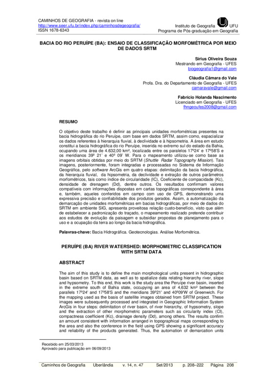 O objetivo deste trabalho é definir as principais unidades morfométricas presentes na bacia hidrográfica do rio Peruípe, com base em dados SRTM, assim como, espacializar os dados referentes à hierarquia fluvial, à declividade e à hipsometria. A área em estudo constitui a bacia hidrográfica do rio Peruípe, inserida no extremo sul do estado da Bahia, ocupando uma área de 4.632,00 km², localizada entre os paralelos 17º24’ e 17º58’S e os meridianos 39º 21’ e 40º 09’ W. Para o mapeamento utilizou-se como base as imagens orbitais obtidas por meio do SRTM (Shuttle Radar Topography Mission). Tais imagens, posteriormente, foram integradas e processadas no Sistema de Informação Geográfica, pelo software ArcGis em quatro etapas: delimitação da bacia hidrográfica, da hierarquia fluvial, da hipsometria, da declividade e extração de outros parâmetros morfométricos, tais como índice de circularidade (IC), Coeficiente de compacidade (Kc), densidade de drenagem (Dd), dentre outros. Os resultados confirmam valores compatíveis com informações dispostas em cartas topográficas correspondente à área e, também, aqueles conferidos em campo com uso de GPS, demonstrando uma expressiva precisão e confiabilidade dos produtos gerados. Assim, a automatização da demarcação de unidades morfométricas em bacias hidrográficas, por meio de dados do SRTM em ambiente SIG, apresenta proveitosa relação custo-benefício, visto que além de estabelecer a padronização do traçado, o mapeamento realizado pretende contribuir aos estudos de evolução da paisagem e subsidiar propostas de planejamento para o uso e a ocupação da terra ao longo da bacia hidrográfica.