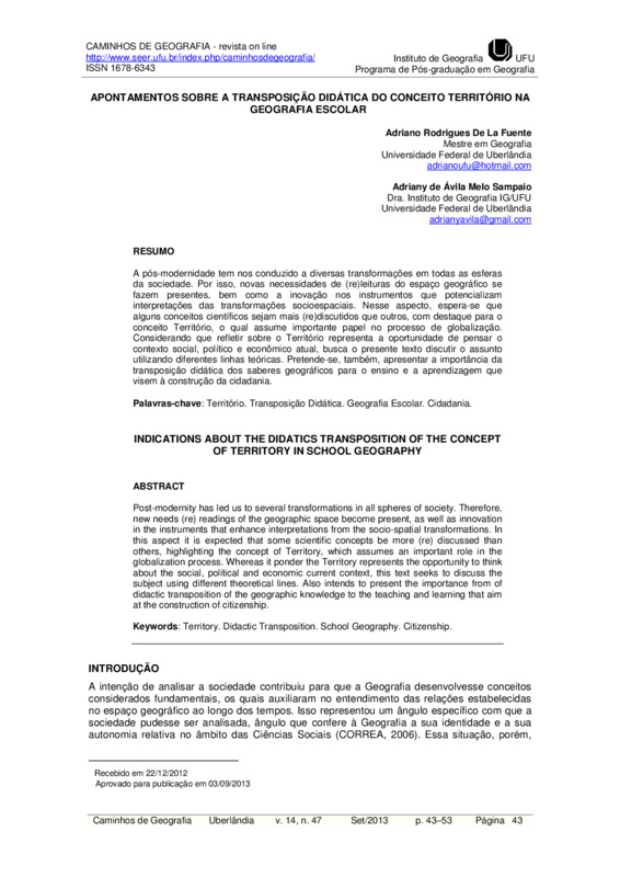 A pós-modernidade tem nos conduzido a diversas transformações em todas as esferas da sociedade. Por isso, novas necessidades de (re)leituras do espaço geográfico se fazem presentes, bem como a inovação nos instrumentos que potencializam interpretações das transformações socioespaciais. Nesse aspecto, espera-se que alguns conceitos científicos sejam mais (re)discutidos que outros, com destaque para o conceito Território, o qual assume importante papel no processo de globalização. Considerando que refletir sobre o Território representa a oportunidade de pensar o contexto social, político e econômico atual, busca o presente texto discutir o assunto utilizando diferentes linhas teóricas. Pretende-se, também, apresentar a importância da transposição didática dos saberes geográficos para o ensino e a aprendizagem que visem à construção da cidadania.