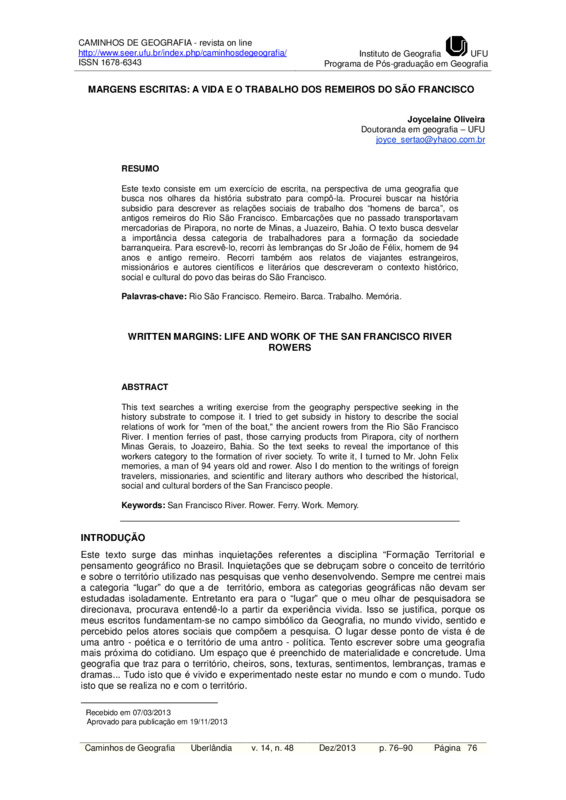 MARGENS ESCRITAS: A VIDA E O TRABALHO DOS REMEIROS DO SÃO FRANCISCO