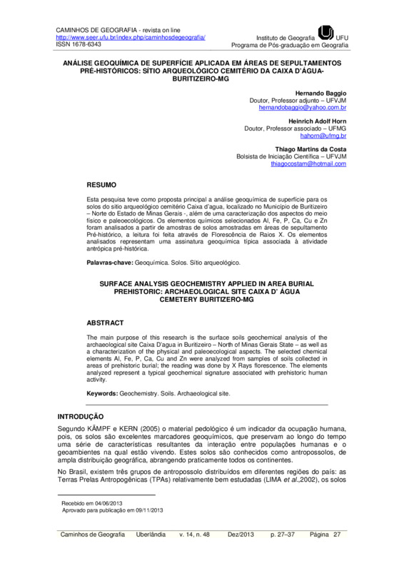 Esta pesquisa teve como proposta principal a análise geoquímica de superfície para os solos do sitio arqueológico cemitério Caixa d’agua, localizado no Município de Buritizeiro – Norte do Estado de Minas Gerais - além, de uma caracterização dos aspectos do meio físico e paleoecológicos. Os elementos químicos selecionados Al, Fe, P, Ca, Cu e Zn foram analisados a partir de amostras de solos amostradas em áreas de sepultamento pré-histórico, a leitura foi feita através de Florescência de Raios X. Os elementos analisados representam uma assinatura geoquímica típica associada à atividade antrópica pré-histórica.
