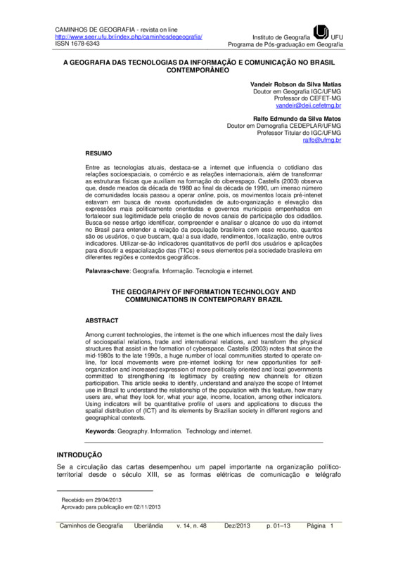 A GEOGRAFIA DAS TECNOLOGIAS DA INFORMAÇÃO E COMUNICAÇÃO NO BRASIL CONTEMPORÂNEO