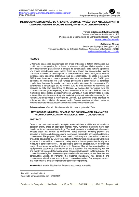O Cerrado está sendo transformado em áreas antrópicas e faltam informações que contribuam com a priorização de áreas de interesse ecológico. Muitos algoritmos têm sido desenvolvidos para auxiliar a biologia da conservação. Este trabalho apresenta um ensaio metodológico para indicar áreas que devem ser conservadas, usando processos analíticos de modelagem e de seleção de áreas, e discute algumas técnicas indicadas para solucionar problemas reais de conservação. Foi usado o programa SITES, com base na ocorrência potencial dos tatus, estabelecida pelo GARP, para selecionar os municípios de Mato Grosso prioritários à conservação. A densidade populacional humana foi usada como uma medida de custo de conservação. Foi considerada a conservação de, no mínimo, 20% da área potencial de ocorrência das espécies de tatu com ocorrência no Cerrado. A maioria dos municípios teve alta ocorrência de tatu (7 e 8 espécies). A insubstituibilidade foi baixa e o SITES incluiu 25 municípios, concentrados principalmente no Cerrado. A maior conectividade ocorreu entre os Rios das Mortes e Araguaia, onde há quatro unidades de conservação. No Pantanal, foi selecionado o município de Cáceres, que concentra áreas alteradas no entorno de três unidades de conservação. Nossas análises mostram como as ferramentas matemáticas podem auxiliar nas ações conservacionistas.