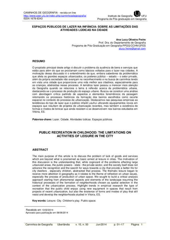O propósito principal deste artigo é discutir o problema da ausência de bens e serviços que estão para além do que se proclamam como básicos voltados para o lazer nas cidades. A motivação dessa discussão é o entendimento de que, embora sabedores da problemática que afeta os grandes espaços urbanizados, os poderes público – estado – o setor privado, além da própria sociedade não avançam no reconhecimento e na busca de caminhos tendo em vista uma cidade que proporcione uma vida melhor aos citadinos, especialmente para as crianças, abstraídas nesse processo. A temática lazer passou a merecer mais atenção da Geografia quando se relaciona o tema à reflexão acerca da problemática urbana, destacando-se o processo de produção do espaço urbano. Buscou-se construir uma análise com abordagem crítica partindo de aspectos e elementos fenomênicos da paisagem retomando os processos históricos da formação dos bairros escolhidos como recorte espacial no contexto do processo de urbanização. Destacamos nas pesquisas empíricas as tendências do tipo de lazer que o público infantil usufrui utilizando equipamentos novos em espaços que resultam de projetos de urbanização recentes, mas também a existência de formas e modos de brincar que ainda resistem e se desenvolvem nos bairros estudados em Vitória, ES.