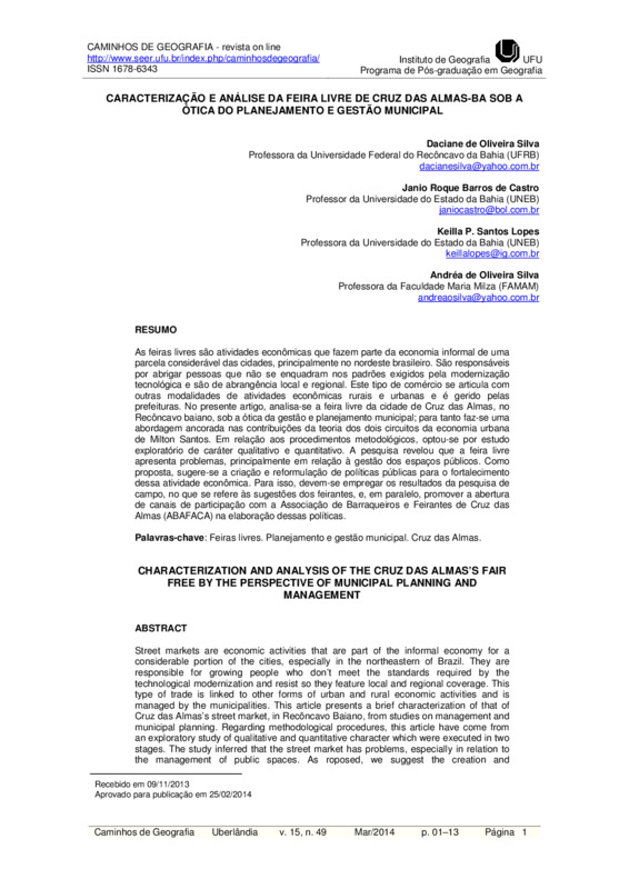 CARACTERIZAÇÃO E ANÁLISE DA FEIRA LIVRE DE CRUZ DAS ALMAS-BA SOB A ÓTICA DO PLANEJAMENTO E GESTÃO MUNICIPAL