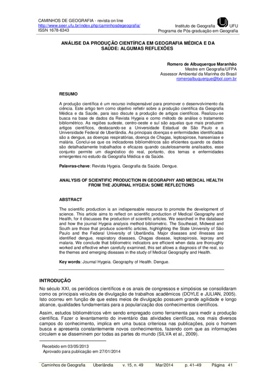 A produção científica é um recurso indispensável para promover o desenvolvimento da ciência. Este artigo tem como objetivo refletir sobre a produção científica da Geografia Médica e da Saúde, para isso discute a produção de artigos científicos. Realizou-se busca na base de dados da Revista Hygeia e como método de análise o tratamento bibliométrico. As regiões sudeste, centro-oeste e sul são aquelas que mais produzem artigos científicos, destacando-se a Universidade Estadual de São Paulo e a Universidade Federal de Uberlândia. As principais doenças e enfermidades identificadas são a dengue, as doenças respiratórias, doença de Chagas, leptospirose, hanseníase e malária. Conclui-se que os indicadores bibliométricos são eficientes quando os dados são detalhadamente trabalhados e eficazes quando cautelosamente analisados, esse conjunto permite um diagnóstico do real, portanto, dos temas e enfermidades emergentes no estudo da Geografia Médica e da Saúde.