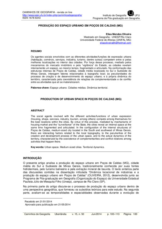 Os agentes sociais envolvidos com as diferentes atividades de expressão urbana (habitação, comércio, serviços, indústria, turismo, dentre outras) competem entre si pelas melhores localizações no interior das cidades. Por força desse processo, mediado pelos mecanismos do mercado imobiliário e pela “vigilância” do Estado, as cidades revelam internamente um espaço, ao mesmo tempo, fragmentado e articulado. Na conformação das estruturas internas de Poços de Caldas, cidade média localizada no Sul e Sudoeste de Minas Gerais, interagem fatores relacionados à topografia local; às peculiaridades do processo de criação e de desenvolvimento do espaço urbano; e à própria dinâmica do território, caracterizada pela coexistência de relações de complementaridade e de conflito entre as atividades que ali se materializaram.