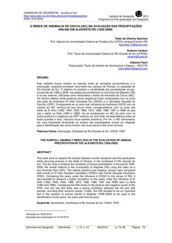 Este trabalho busca ampliar os estudos entre as variações pluviométricas e a arenização, enquanto processo recorrente nos campos do Pampa, no sudoeste do Rio Grande do Sul. O objetivo foi analisar a variabilidade das precipitações anuais, no período de 1928 a 2009, nos postos pluviométricos no município de Alegrete (RS) e no seu entorno, utilizando como ferramenta o Índice de Anomalia de Chuva (IAC). Os índices obtidos (tanto positivos como negativos) foram comparados com os anos sob ação do fenômeno El Niño Oscilação Sul (ENOS) e a Oscilação Decadal do Pacífico (ODP). Comparando-se os anos sob influência do fenômeno ENOS com os valores do IAC verificou-se que houve maior correspondência com os anos sob efeito do El Niño (1932, 1940, 1959, 1966, 1973, 1982, 1986, 1997 e 1998) do que sob o efeito La Niña (1964 e 1989). Ao se compararem os IAC da série com os ciclos positivos e negativos da ODP verificou-se uma forte correspondência entre as fases quentes e frias, inclusive seus eventos extremos. Por fim, o IAC demonstrou ser uma importante ferramenta na análise das precipitações anuais em Alegrete para a identificação dos anos úmidos, dos anos secos e dos anos normais.