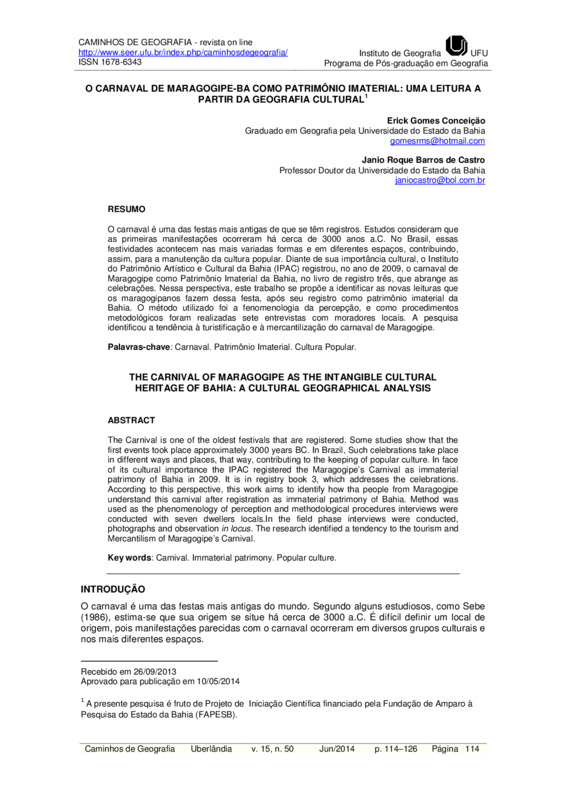 O carnaval é uma das festas mais antigas que se têm registros. Estudos datam que as primeiras manifestações ocorreram a cerca de 3000 anos a.C. No Brasil essas festividades ocorrem nas mais variadas formas em diferentes espaços, contribuindo assim, para a manutenção da cultural popular. Diante de sua importância cultural, o IPAC registrou o carnaval de Maragogipe como Patrimônio Imaterial da Bahia no ano de 2009, estando no livro de registro três, que abrange as celebrações. Nessa perspectiva, esse trabalho se propõe a identificar as novas leituras que os maragogipanos fazem desse carnaval após o registro em patrimônio imaterial da Bahia. Como método foi utilizado a fenomenologia da percepção e os procedimentos metodológicos foram realizadas entrevistas com sete moradores locais. A pesquisa identificou uma tendência a turistificação e mercantilização do carnaval de Maragagogipe.