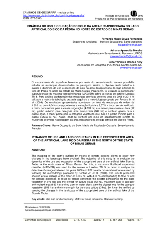 O mapeamento da superfície terrestre por meio do sensoriamento remoto possibilita a estudar as mudanças desenvolvidas na paisagem. Assim, o objetivo deste trabalho é avaliar a dinâmica do uso e ocupação do solo na área desapropriada do lago artificial do Bico da Pedra no norte do estado de Minas Gerais. Para tanto, foi utilizado o classificador supervisionado de máxima verossimilhança (MAXVER) sobre as cenas do satélite Landsat TM 5. Para análise da detecção das mudanças ocorridas entre os anos de 2006 e 2011 foi utilizado a matriz de tabulação cruzada seguindo a metodologia proposta por Pontius Jr. et al., (2004). Os resultados apresentados apontaram um total de mudanças da ordem de 1.305 ha, com 4,04% correspondentes a variação líquida e 9,57% a troca, sendo verificado a maior persistência para a classe vegetação (4.078 ha) e a menor para classe cultura (12 ha), ganho máximo para categoria área antropizada (682 ha) e nenhum ganho para a classe água, a maior perda para a categoria vegetação (659 ha) e o ganho mínimo para a classe cultura (3 ha). Tais resultados mostram que houve aumento de áreas antropizadas e decréscimo de áreas alagadas na área desapropriada do lago artificial do Bico da Pedra
