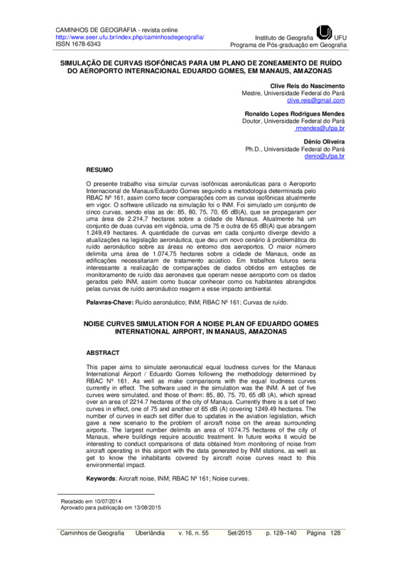 O presente trabalho visa simular curvas isofônicas aeronáuticas para o Aeroporto Internacional de Manaus/Eduardo Gomes seguindo a metodologia determinada pelo RBAC Nº 161, assim como tecer comparações com as curvas isofônicas atualmente em vigor. O software utilizado na simulação foi o INM. Foi simulado um conjunto de cinco curvas, sendo elas as de: 85, 80, 75, 70, 65 dB(A), que se propagaram por uma área de 2.214,7 hectares sobre a cidade de Manaus. Atualmente há um conjunto de duas curvas em vigência, uma de 75 e outra de 65 dB(A) que abrangem 1.249,49 hectares. A quantidade de curvas em cada conjunto diverge devido a atualizações na legislação aeronáutica, que deu um novo cenário à problemática do ruído aeronáutico sobre as áreas no entorno dos aeroportos. O maior número delimita uma área de 1.074,75 hectares sobre a cidade de Manaus, onde as edificações necessitariam de tratamento acústico. Em trabalhos futuros seria interessante a realização de comparações de dados obtidos em estações de monitoramento de ruído das aeronaves que operam nesse aeroporto com os dados gerados pelo INM, assim como buscar conhecer como os habitantes abrangidos pelas curvas de ruído aeronáutico reagem a esse impacto ambiental.