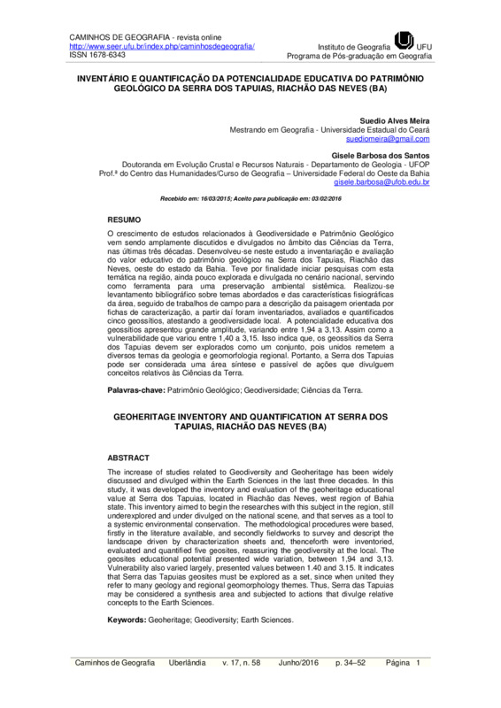 O crescimento de estudos relacionados à Geodiversidade e Patrimônio Geológico vem sendo amplamente discutidos e divulgados no âmbito das Ciências da Terra, nas últimas três décadas. Desenvolveu-se neste estudo a inventariação e avaliação do patrimônio geológico na Serra dos Tapuias, Riachão das Neves, oeste do estado da Bahia, que teve por finalidade iniciar pesquisas com esta temática na região, ainda pouco explorada e divulgada no cenário nacional, servindo como ferramenta para uma preservação ambiental sistêmica. Realizou-se levantamento bibliográfico sobre temas abordados e das características fisiográficas da área, seguido de trabalhos de campo para a descrição da paisagem orientada por fichas de caracterização, a partir daí foram inventariados, avaliados e quantificados cinco geossítios (dois isolados, dois área e um panorâmico), atestando a geodiversidade local. O cálculo dos valores de potencialidade e vulnerabilidade apresentou grande amplitude, as potencialidades educativas variaram de 1,94 a 3,13. A vulnerabilidade variou de 1,40 a 3,15. Isso indica que, os geossítios da Serra dos Tapuias devem ser explorados como um conjunto, pois unidos remetem a todos os temas da geologia e geomorfologia regional. Portanto, a Serra dos Tapuias pode ser considerada uma área síntese e passível de ações que divulguem conceitos relativos às Ciências da Terra.