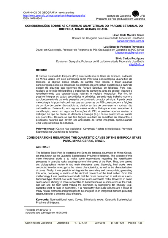 O Parque Estadual do Ibitipoca (PEI) está encravado na Serra do Ibitipoca, a sudoeste do Estado de Minas Gerais, numa área conhecida como Província Espeleológica Quartzítica de Ibitipoca, devido ao elevado número de cavernas que são encontradas na região. O objetivo desse estudo, de caráter mais teórico, é tecer algumas considerações sobre os processos de carstificação em rochas quartzíticas a partir do estudo de algumas das cavernas do Parque Estadual do Ibitipoca. Para isso, realizou-se revisão bibliográfica a partir de dois eixos teóricos principais, a saber: i- estudo sobre as feições cársticas da Serra do Ibitipoca e ii- considerações sobre carste não tradicional. Num segundo momento foram realizados os trabalhos de campo na área de estudo, visando ao reconhecimento das características naturais, bem como a caracterização das cavernas, oportunizando o seu georreferenciamento e registro fotográfico. E, por fim, em gabinete, foi possível integrar os dados secundários e primários, gerando o texto aqui apresentando como o aprofundamento de uma vertente abordada na pesquisa de doutorado do autor principal. A partir desta metodologia foi possível depreender que as cavernas do PEI correspondem a feições de um tipo de carste não-tradicional, devido ao fato de ocorrerem em rochas não carbonáticas. Entretanto, em alguns casos onde a litologia é mais suscetível à carstificação como em algumas Formações do PEI, é possível apenas realizar a distinção do tipo de carste ao destacar a litologia (e.g.: carste quartzítico ou carste em quartzitos). Destaca-se que tais feições no PEI resultam do somatório de elementos e processos naturais que devem ser analisados de forma integrada, oportunizando uma visão sistêmica da natureza.