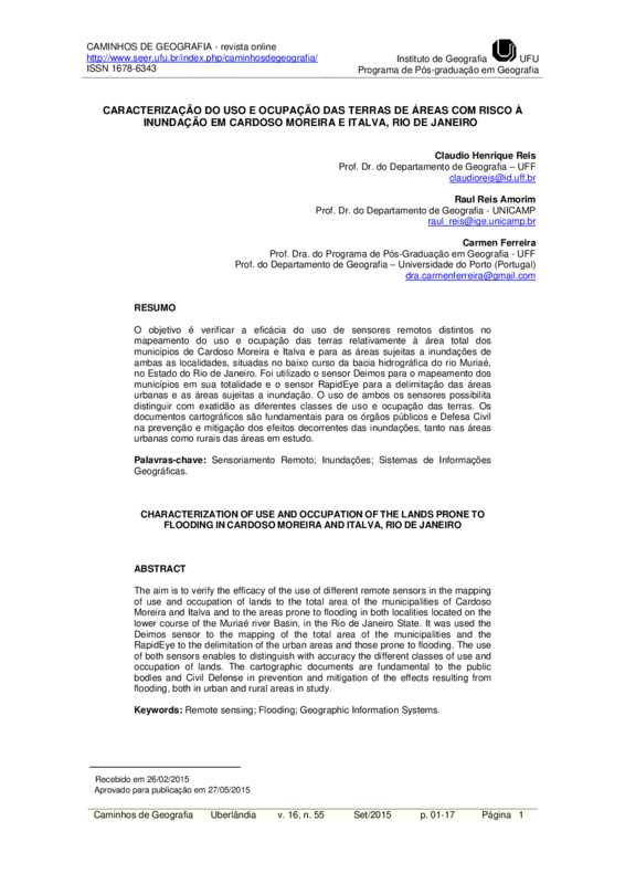 O objetivo é verificar a eficácia do uso de sensores remotos distintos no mapeamento do uso e ocupação das terras relativamente à área total dos municípios de Cardoso Moreira e Italva e para as áreas sujeitas a inundações de ambas as localidades, situadas no baixo curso da bacia hidrográfica do rio Muriaé, no Estado do Rio de Janeiro. Foi utilizado o sensor Deimos para o mapeamento dos municípios em sua totalidade e o sensor RapidEye para a delimitação das áreas urbanas e as áreas sujeitas a inundação. O uso de ambos os sensores possibilita distinguir com exatidão as diferentes classes de uso e ocupação das terras. Os documentos cartográficos são fundamentais para os órgãos públicos e Defesa Civil na prevenção e mitigação dos efeitos decorrentes das inundações, tanto nas áreas urbanas como rurais das áreas em estudo.