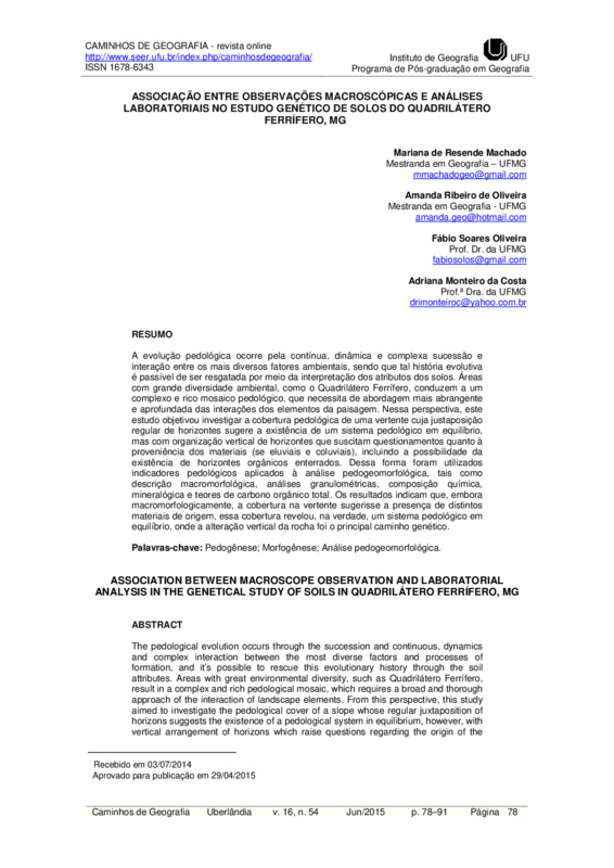 ASSOCIAÇÃO ENTRE OBSERVAÇÕES MACROSCÓPICAS E ANÁLISES LABORATORIAIS NO ESTUDO GENÉTICO DE SOLOS DO QUADRILÁTERO FERRÍFERO, MG