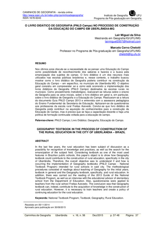 Nos últimos anos discute-se a necessidade de se pensar uma Educação do Campo como possibilidade de reconhecimento dos saberes e fazeres e a busca pela emancipação dos sujeitos do campo. O livro didático é um dos recursos mais utilizados nas escolas públicas brasileiras e, nesse contexto, o trabalho buscou mostrar como o livro didático de Geografia poderia contribuir na construção da Educação do Campo – em específico, no município de Uberlândia-MG. O objetivo geral consistiu em compreender se e como está ocorrendo a implementação dos livros didáticos de Geografia (PNLD Campo) destinados às escolas rurais no município. Como procedimento metodológico, realizaram-se leituras sobre o ensino de Geografia para os anos iniciais, sobre o livro didático em geral e, em particular, sobre o livro didático de Geografia e a Educação do Campo. Realizaram-se a leitura do documento Guia PNLD Campo 2013 e entrevista com a assessora pedagógica do Ensino Fundamental da Secretaria de Educação. Aplicaram-se de questionários aos professores da escola rural Freitas Azevedo. Conclui-se que livro didático de Geografia pode contribuir na aquisição de conhecimentos para a construção da Educação do Campo, mas é preciso que se faça a capacitação docente e haja uma política de formação continuada voltada para a educação do campo.