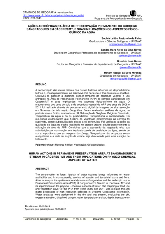 AÇÕES ANTRÓPICAS NA ÁREA DE PRESERVAÇÃO PERMANENTE DO CÓRREGO SANGRADOURO EM CÁCERES/MT, E SUAS IMPLICAÇÕES NOS ASPECTOS FÍSICO-QUÍMICO DA ÁGUA