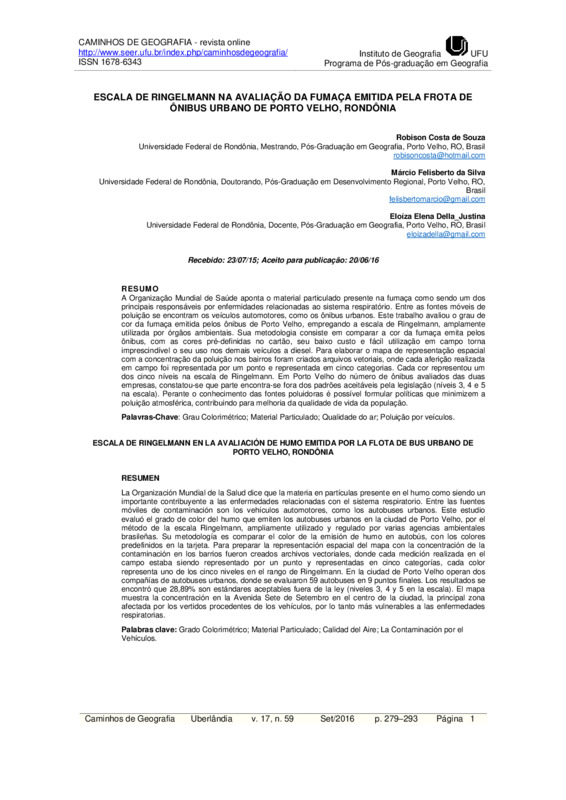 A Organização Mundial de Saúde aponta o material particulado presente na fumaça como sendo um dos principais responsáveis por enfermidades relacionadas ao sistema respiratório. Entre as fontes móveis de poluição se encontram os veículos automotores, como os ônibus urbanos. Este trabalho avaliou o grau de cor da fumaça emitida pelos ônibus urbanos de Porto Velho, pelo método da escala de Ringelmann, amplamente utilizado e regulamentado por diversos órgãos ambientais brasileiros. Sua metodologia consiste em comparar a cor da fumaça emita pelos ônibus, com as cores pré-definidas no cartão. Para elaborar o mapa de representação espacial com a concentração da poluição nos bairros foram criados arquivos vetoriais, onde cada aferição realizada em campo ficou sendo representada por meio de um ponto e representadas em cinco categorias, cada cor representou um dos cinco níveis na escala de Ringelmann. Em Porto Velho operam duas empresas de ônibus urbanos, foram avaliados 59 ônibus, em 9 pontos finais. Nos resultados constatou-se que 28,89% estão fora dos padrões aceitáveis pela legislação (níveis 3, 4 e 5 na escala). O mapa mostra concentração na avenida Sete de Setembro, no centro da cidade, principal área atingida pelas descargas dos veículos, portanto de maior vulnerabilidade a doenças respiratórias.