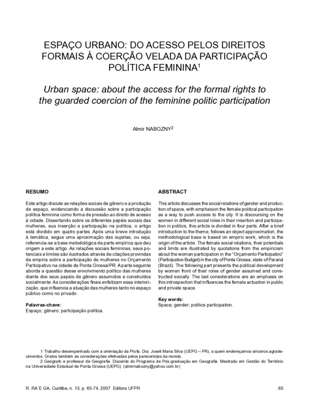 Este artigo discute as relações sociais de gênero e a produçãode espaço, evidenciando a discussão sobre a participaçãopolítica feminina como forma de pressão ao direito de acessoà cidade. Dissertando sobre os diferentes papéis sociais dasmulheres, sua inserção e participação na política, o artigoestá dividido em quatro partes. Após uma breve introduçãoà temática, segue uma aproximação das sujeitas, ou seja,referencia-se a base metodológica da parte empírica que deuorigem a este artigo. As relações sociais femininas, seus potenciaise limites são ilustrados através de citações provindasda empiria sobre a participação de mulheres no OrçamentoParticipativo na cidade de Ponta Grossa/PR. A parte seguinteaborda a questão desse envolvimento político das mulheresdiante dos seus papéis de gênero assumidos e construídossocialmente. As considerações finais enfatizam essa interiorização,que influencia a atuação das mulheres tanto no espaçopúblico como no privado.