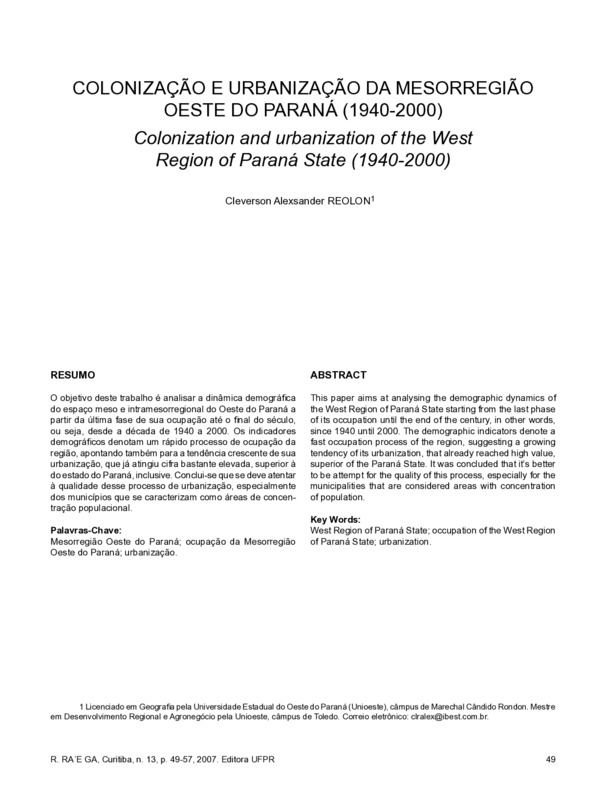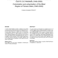 O objetivo deste trabalho é analisar a dinâmica demográficado espaço meso e intramesorregional do Oeste do Paraná apartir da última fase de sua ocupação até o final do século,ou seja, desde a década de 1940 a 2000. Os indicadoresdemográficos denotam um rápido processo de ocupação daregião, apontando também para a tendência crescente de suaurbanização, que já atingiu cifra bastante elevada, superior àdo estado do Paraná, inclusive. Conclui-se que se deve atentarà qualidade desse processo de urbanização, especialmentedos municípios que se caracterizam como áreas de concentraçãopopulacional.