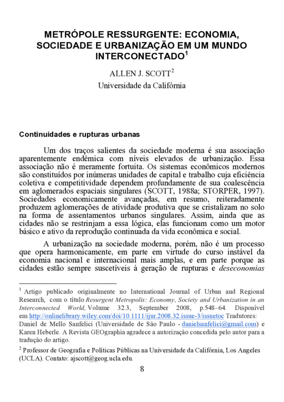 Uma problemática urbana é identificada acerca das características essenciais das cidades enquanto conjuntos de atividade humana espacialmente polarizados e marcados por simbiose interna elevada. As raízes da crise da metrópole industrial clássica do século XX são identificadas e o surgimento de um novo tipo de dinâmica econômica urbana ao longo dos anos 1980 e 1990 é discutido. Meu argumento é de que essa nova dinâmica baseia-se, em grande medida, no crescimento e disseminação de sistemas de produção cultural-cognitivos. Em paralelo a essas mudanças ocorreram profundas transformações no espaço urbano e na vida social, e muitas cidades empreenderam esforços para se consolidarem como centros culturais nacionais e internacionais. Esse argumento é o fundamento do que podemos chamar de hipótese da metrópole ressurgente. Os efeitos da globalização são considerados como de fundamental importância na gênese e geografia do ressurgimento urbano. Três dilemas políticos das cidades ressurgentes são destacados: sua fragmentação institucional interna; o fortalecimento de sua condição de agentes econômicos em escala global e a importância concomitante das formas coletivas de construção de vantagens competitivas localizadas; e a intensificação de sua desintegração e segmentação sociais.