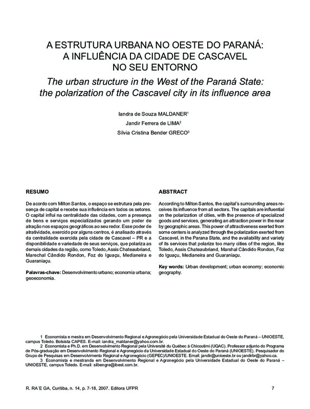 A ESTRUTURA URBANA NO OESTE DO PARANÁ: A INFLUÊNCIA DA CIDADE DE CASCAVEL NO SEU ENTORNO