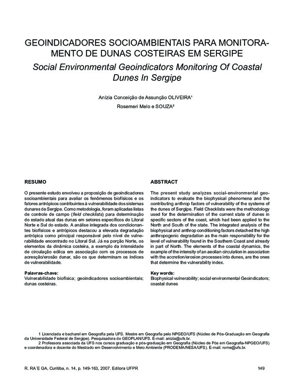 O presente estudo envolveu a proposição de geoindicadoressocioambientais para avaliar os fenômenos biofísicos e osfatores antrópicos contribuintes à vulnerabilidade dos sistemasdunares de Sergipe. Como metodologia, foram aplicadas listasde controle de campo (field checklists) para determinaçãodo estado atual das dunas em setores específicos do LitoralNorte e Sul do estado. A análise integrada dos condicionantesbiofísicos e antrópicos destacou a elevada degradaçãoantrópica como principal responsável pelo nível de vulnerabilidadeencontrado no Litoral Sul. Já na porção Norte, oselementos da dinâmica costeira, a exemplo da intensidadede circulação eólica em associação com os processos deacresção/erosão dunar, são os que determinam os índicesde vulnerabilidade.