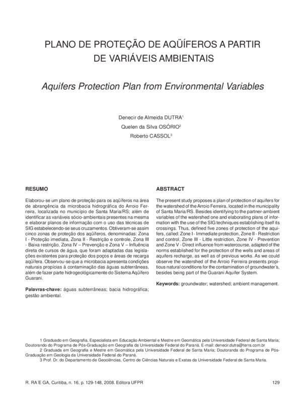 O presente estudo teve como objetivo geral propor um plano de proteção dos aqüíferos para a microbacia hidrográfica do Arroio Ferreira, localizado no município de Santa Maria/RS; além de identificar as variáveis sócio-ambientais presentes na mesma e elaborar planos de informação com o uso das técnicas de SIG estabelecendo-se seus cruzamentos. Obtiveram-se assim cinco zonas de proteção dos aqüíferos, denominadas: Zona I - Proteção imediata, Zona II - Restrição e controle, Zona III - Baixa restrição, Zona IV – Prevenção e Zona V – Influência direta de cursos d’água, adaptadas das normas estabelecidas para a proteção dos poços e áreas de recarga aqüífera. Observou-se que a microbacia apresenta condições naturais propícias à contaminação das águas subterrâneas, além de fazer parte hidrogeológicamente do Sistema Aqüífero Guarani.