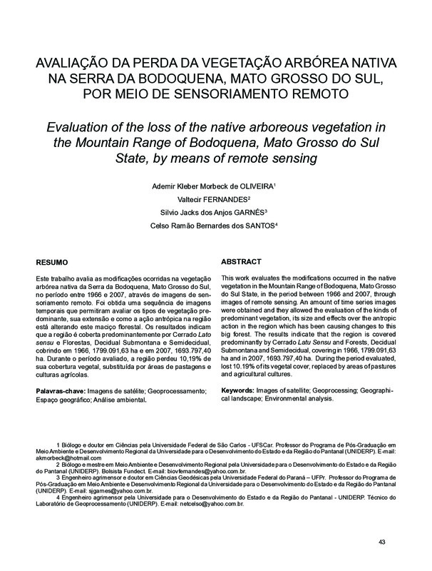 AVALIAÇÃO DA PERDA DA VEGETAÇÃO ARBÓREA NATIVA NA SERRA DA BODOQUENA, MATO GROSSO DO SUL, POR MEIO DE SENSORIAMENTO REMOTO