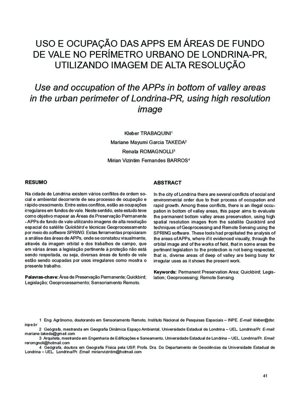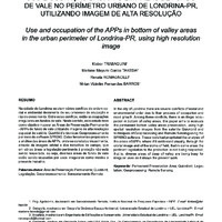 Na cidade de Londrina existem vários conflitos de ordem social e ambiental decorrente de seu processo de ocupação e rápido crescimento. Entre estes conflitos, estão às ocupações irregulares em fundos de vale. Neste sentido este estudo teve como objetivo mapear as Áreas de Preservação Permanente - APPs de fundo de vale utilizando imagens de alta resolução espacial do satélite Quickbird e técnicas Geoprocessamento por meio do software SPRING. Estas ferramentas propiciaram a análise das áreas de APPs, onde se constatou visualmente, através da imagem orbital e dos trabalhos de campo, que em várias áreas a legislação pertinente à proteção não está sendo respeitada, ou seja, diversas áreas de fundo de vale estão sendo ocupadas por usos irregulares como mostra o presente trabalho.