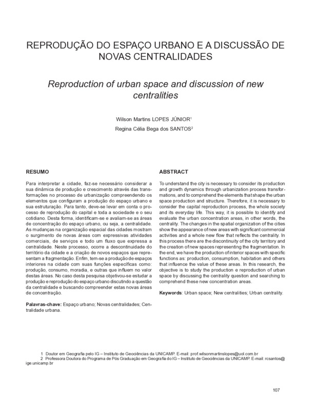 Para interpretar a cidade, faz-se necessário considerar a sua dinâmica de produção e o seu crescimento através das transformações no processo de urbanização compreendendo os elementos que configuram a produção do espaço urbano e sua estruturação. Para tanto, deve-se levar em conta o processo de reprodução do capital e toda a sociedade e o seu cotidiano. Desta forma, identificam-se e avaliam-se as áreas de concentração do espaço urbano, ou seja, a centralidade. As mudanças na organização espacial das cidades mostram o surgimento de novas áreas com expressivas atividades comerciais, de serviços e todo um fluxo que expressa a centralidade. Neste processo, ocorre a descontinuidade do território da cidade e a criação de novos espaços que representam a fragmentação. Enfim, tem-se a produção de espaços interiores na cidade com suas funções específicas como: produção, consumo, moradia, e outras que influem no valor destas áreas. No caso desta pesquisa objetivou-se estudar a produção e reprodução do espaço urbano discutindo a questão da centralidade e buscando compreender estas novas áreas de concentração.